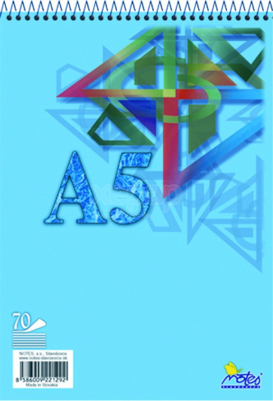 Blok A5 čistý so špirálovou väzbou hore, biely papier, 70 dierovaných listov s perforáciou pozdĺž hornej strany.