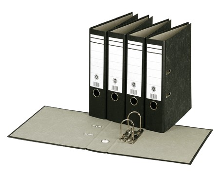 Kartónové poradače s mramorovou úpravou povrchu - vonkajší tmavý papier, vnútorný svetlý papier. Formát A4, páková mechanika, šírka chrbta 75 mm. Celopapierový obal, chrbtový otvor, radokrúžok.