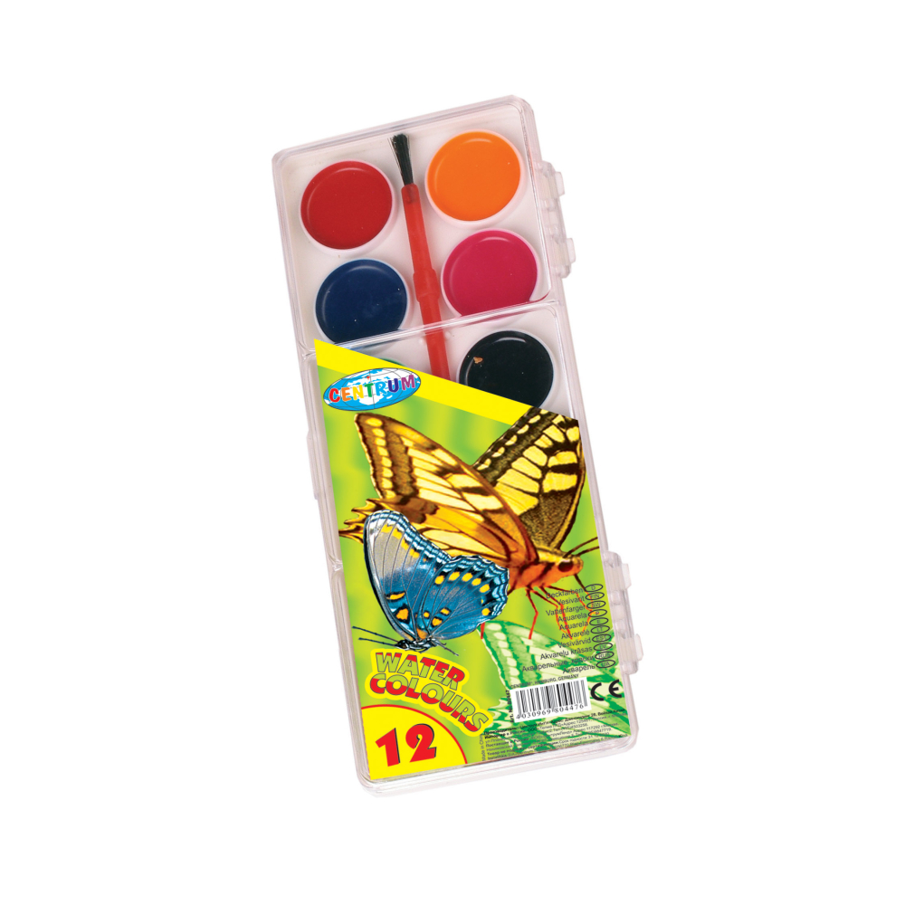 Školské vodové farby polosuché s motívom Zoo, 12 farieb, 20mm. Balenie obsahuje aj 1ks štetec.