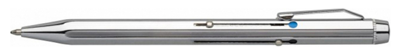 Celokovové pero so štyrmi rôznymi farbami náplní (červená, zelená, čierna a modrá). Farba tela strieborná. Náhradné náplne krátke 67 mm