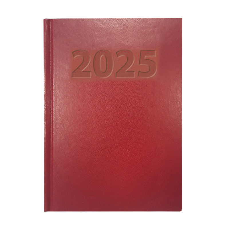 Diár denný, formát A5, obal um. koženka. Farba: bordová. Plánovací kalendár . Každý list obsahuje v spodnej časti prehľadný kalendár na 6 mesiacov.