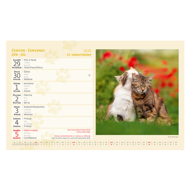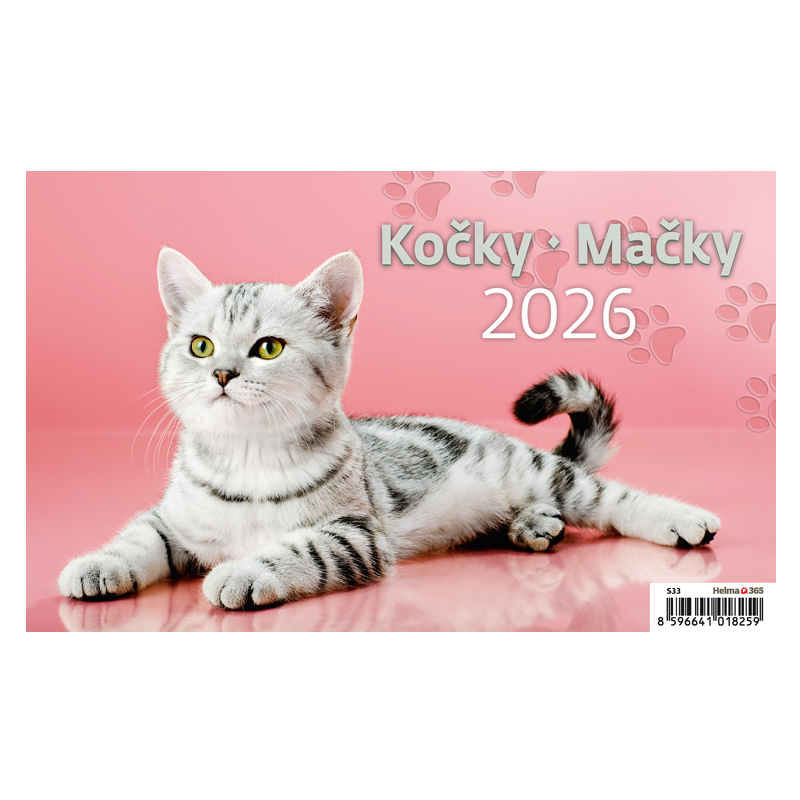 Formát kalendára: 22,6 x 13,9 cm • Kalendárium: české/slovenské týždenné riadkové • Počet strán kalendára: 58 + 2 • Stojanček: so zámkom • Priestor na potlač: 22,6 x 3 cm • + 365 mačacích mien