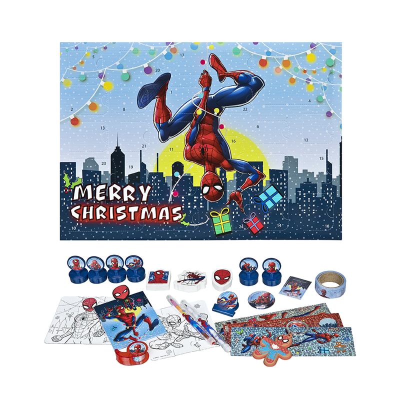 Adventný kalendár obsahuje na každý deň prekvapenie: 2x puzzle, 6x mini pečiatky, 1x mini krieda, 2x samolepky, 1x poznámkový blok, 3x samolepkové listy, 1x lepiaca páska s dispenzorom, 2x spona na papiere, 1x kľúčenka, 1x ceruzka, 3x guma.