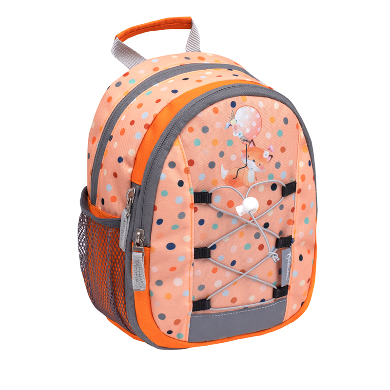 Zadná strana batohu obsahuje mäkkú penu pre pohodlné nosenie. Polstrované ramenné popruhy sú ľahko nastaviteľné, takže sú pohodlné na chrbát predškolákov. Navyše je batoh dodávaný s hrudným popruhom , ktorého dĺžku je možné nastaviť. Hrudné popruhy sú v tomto veku dôležité, pretože zabraňujú skĺznutiu batohu z detských ramien. Väčšia priehradka poskytuje dostatok priestoru pre plyšové hračky, malú deku alebo oblečenie. Predná priehradka je ideálna na uloženie boxu na desiatu. Táto priehradka sa dá rozšíriť asi o 6 cm. Do bočných vreciek sa zmestí fľaša na vodu (do 0,7 l) a dáždnik. Zipsy sa veľmi ľahko otvárajú a zatvárajú aj malými detskými rukami a prstami. Reflexné prvky umiestnené vpredu a vzadu zvyšujú viditeľnosť. Má dostatočne dlhú rukoväť, aby ho aj rodičia mohli pohodlne nosiť.. Materiál: vodeodolný polyester. Rozmer: 23x20x15cm.