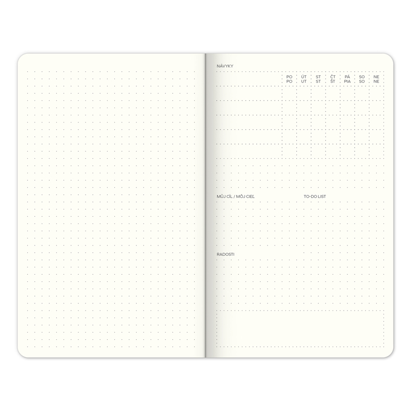 Chceli by ste si diár prispôsobiť svojim potrebám, ale neviete, ako začať? My bullet planner je tým pravým pre začiatočníkov v oblasti kreatívneho zapisovania. Nenútene vás prevedie pravidelným plánovaním, v ktorom budete sledovať svoje návyky, ''to-do'' listy a iné ciele a zároveň vám poskytne plno miesta na vytvorenie vášho systému. Nedatované týždenné kalendárium vám umožní začať kedykoľvek počas roka. Parametre: Šírka:13 cm Výška:21 cm Téma:Pracovné Hĺbka:1 cm Gramáž:115 g/m2 Väzba:tuhá knižná s gumičkou a pútkom na ceruzku