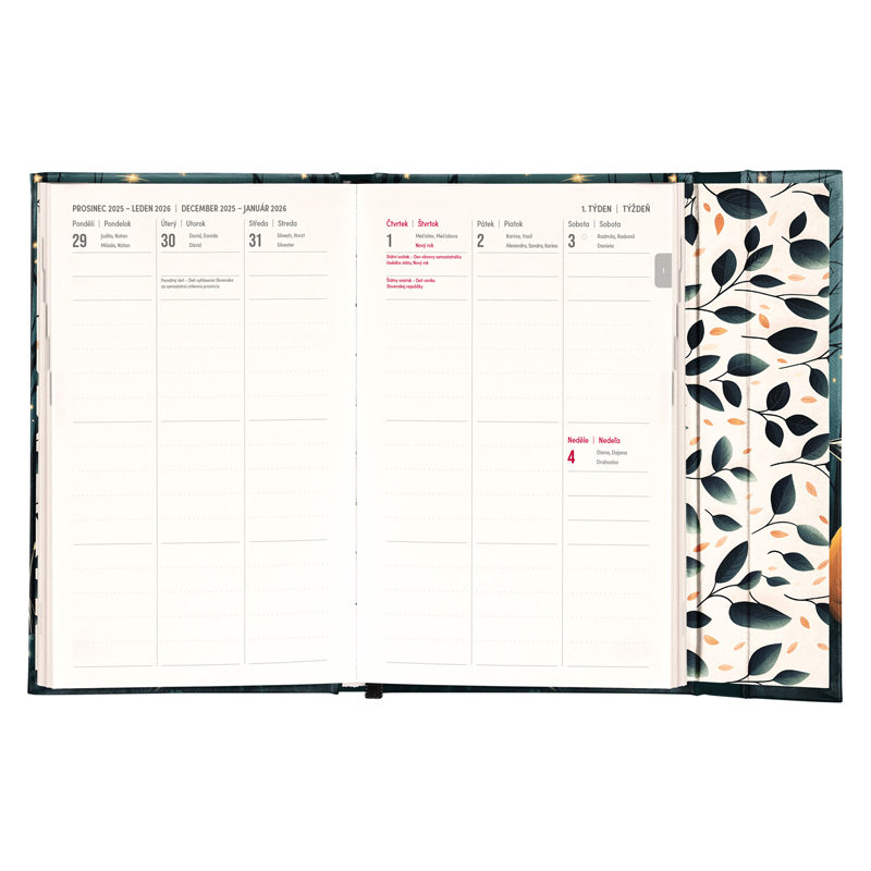 Šesťjazyčný týždenný diár s medzinárodnými sviatkami a praktickým magnetickým uzatváraním je ideálnou voľbou pre tých, ktorí chcú mať svoje plány prehľadne pod kontrolou. Ponúka stĺpcové rozvrhnutie jednotlivých týždňov s dostatkom priestoru pre každodenné poznámky.Súčasťou sú praktické mesačné prehľady, ideálne na plánovanie dovoleniek či prázdnin. Rozmery: 130x210 mm. Počet strán 144.