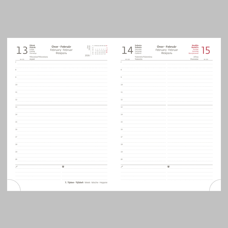 Recyklovaný diár s mäkkým povrchom. Elegantný diár vyrobený za použitia recyklovaných materiálov s príjemným mäkkým povrchom, ktorý dodáva luxusný pocit pri dotyku. Vnútorné listy z recyklovaného bieleho ofsetového papiera zaisťujú pohodlné písanie. Dosky umožňujú personalizáciu sleporažbou. Diár je vhodný pre náročného a ekologicky zmýšľajúceho používateľa. Diár obsahuje: osobné údaje, plánovač dovolenky (mesačný prehľad), plánovací kalendár, telefónne predvoľby, štátne sviatky Českej a Slovenskej republiky, medzinárodné sviatky, ročný výhľad, denný layout, adresár, mapa Európy a Českej a Slovenskej republiky. Rozmery: 145x205 mm. Počet strán: 352.