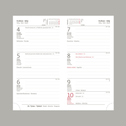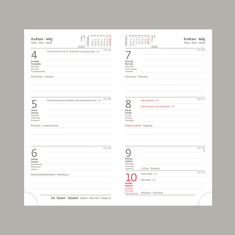 Recyklovaný diár s mäkkým povrchom. Elegantný diár vyrobený za použitia recyklovaných materiálov s príjemným mäkkým povrchom, ktorý dodáva luxusný pocit pri dotyku. Vnútorné listy z recyklovaného bieleho ofsetového papiera zaisťujú pohodlné písanie. Dosky umožňujú personalizáciu sleporažbou. Diár je vhodný pre náročného a ekologicky zmýšľajúceho používateľa. Diár obsahuje: osobné údaje, plánovač dovolenky (mesačný prehľad), plánovací kalendár, medzinárodné sviatky, ročný výhľad, týždenný layout, adresár. Rozmery: 80x150 mm. Počet strán: 128.