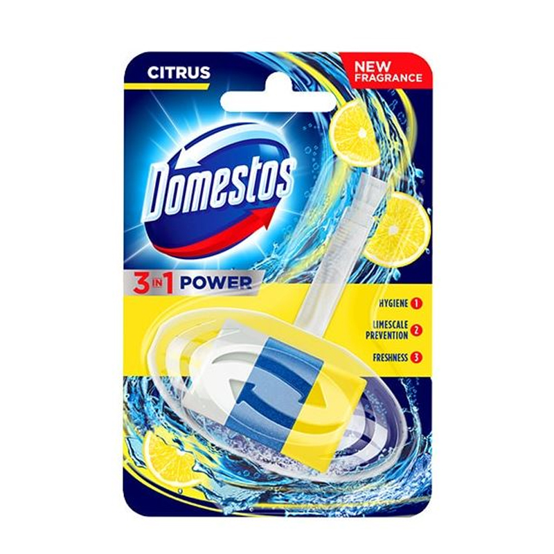 3 v 1 tuhé WC bloky sú zložené z troch špeciálnych vrstiev a kombinujú tak tri účinky: Likvidujú prostredie pre množenie baktérií, bránia tvorbe vodného kameňa, vďaka obsahu parfumovaného gélového prúžku zanechávajú dlhotrvajúcu sviežu vôňu po každom spláchnutí. Tuhé bloky prinášajú intenzívnejšiu vôňu, výraznejšie napenenie a kompletnú hygienickú čistotu po každom spláchnutí. Návod na použitie: držiak umiestnite na hranu WC misy na vodou dostatočne splachované miesto. Keď je klietka prázdna, doplňte náhradnú náplň Domestos. Potom si umyte ruky. Pokiaľ v klietke zostane len nerozpustený zvyšok gélového prúžku, vytiahnite ho a vyhoďte do koša.Výmena je teraz jednoduchá a hygienická, vďaka systému otvárania klietky “”easy click””