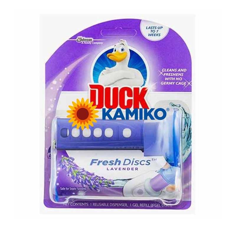 Duck Fresh Disc - čistič WC Levanduľa. Čistí s každým spláchnutím a odstraňuje vodný kameň. Vôňa vydrží až 720 spláchnutí.