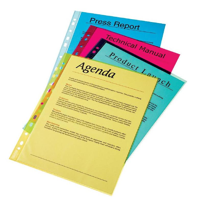 Plastový obal s eurozávesom na ukladanie materiálov. Hladký a farebný povrch umožňuje prehľadné členenie uložených materiálov. Hrúbka 0,050 mm. Balené 10 ks jednotlivo po farbách.