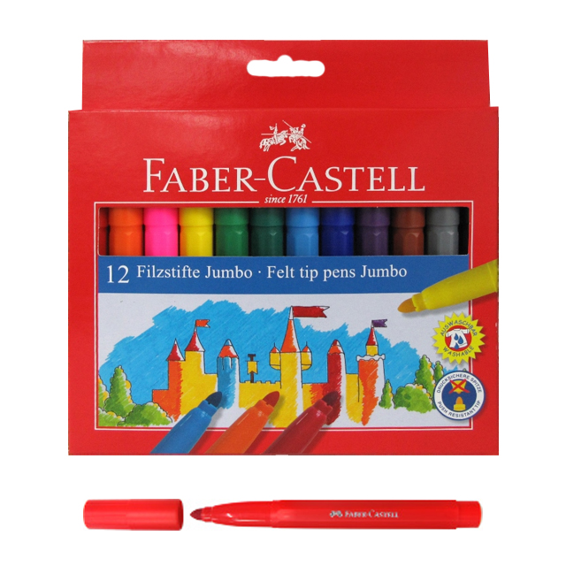 Popisovače Faber Castell Jumbo Fibre 12 farebné Popisovače alebo fixky pre každú situáciu: na maľovanie väčších plôch aj pre kreslenie jemných línií a detailov. Prevedenie Jumbo. · Vhodné na papier, kartón · Pevný, odolný hrot · Vyprateľné z väčšiny textílií · 12 farebné