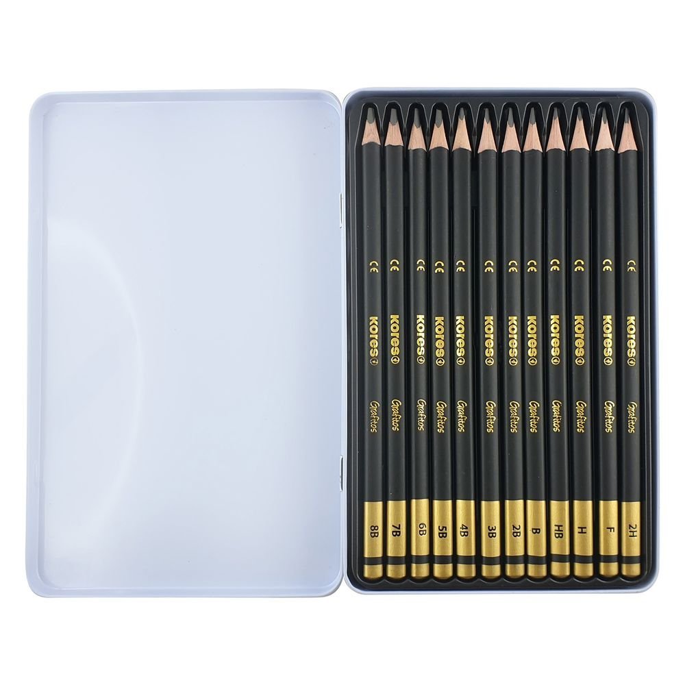 Grafitová ceruzka, sada, kovová škatuľa, trojhranná, KORES ''GRAFITOS'', 12 rôznych tvrdostí