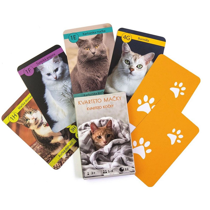 Kartová hra kvarteto s motívom mačky. Kvarteto je hra, kde hráči ťahajú karty jeden od druhého a skladajú z nich štvorice. Víťazom sa stáva hráč, ktorý nemá v ruke žiadne karty a na stole má najviac ''kvartet''.