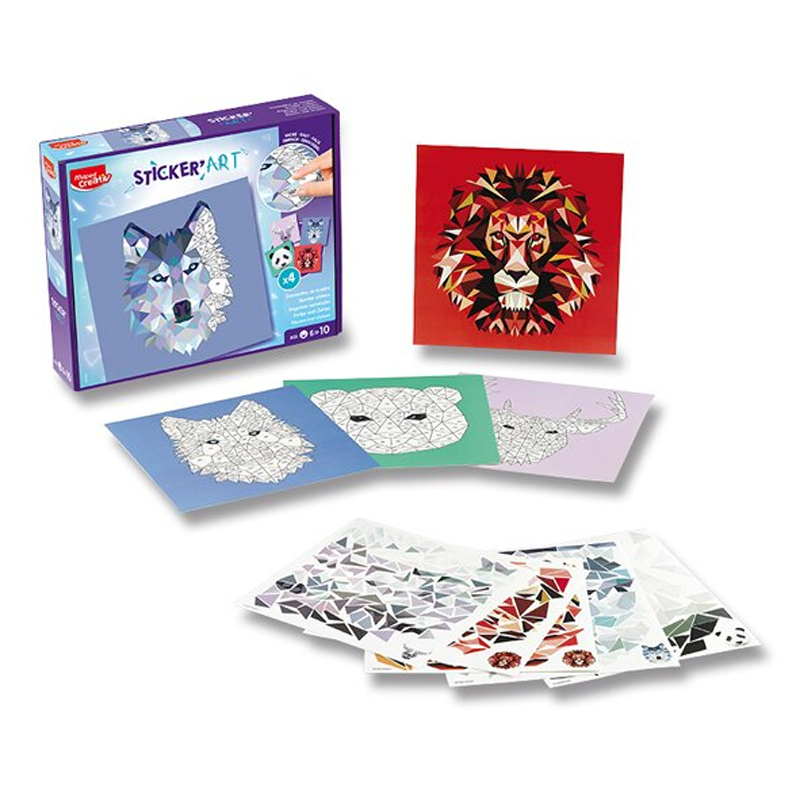 Kreatívna sada Maped Sticker' Art na vytváranie nádherných origami portrétov zvierat pomocou techniky číslovaných nálepiek. Úspech zaručený: nasledujete čísla uvedené na samolepkách a neurobíte chybu. Sada obsahuje 4 kartónové karty (20 x 20 cm) pre 4 rôzne úrovne obtiažnosti, 5 hárkov samolepiacich etikiet, 1 kartónový klin, ktorý sa zmení na stojan, návod na použitie. Vhodné pre deti cca od 6 rokov podľa zručnosti dieťaťa. Súprava obsahuje: 4 kartónové karty (20 x 20 cm) 5 hárkov samolepiacich etikiet 1 kartónový klin, ktorý sa zmení na stojan návod na použitie
