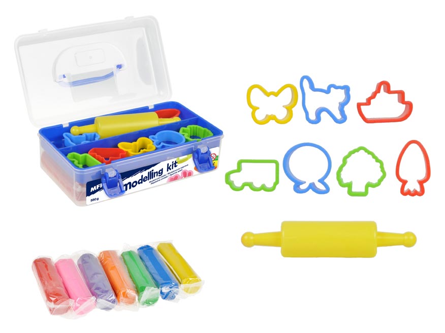 Kreatívna modelovacia súprava (550 g), ktorá rozvíja zručnosť a kreatívnosť dieťaťa.Súprava obsahuje:-7 farieb modelovacej hmoty (ružová, oranžová, žltá, červená, zelená, modrá a fialová)-7 farebných formičiek rôznych tvarov-1 valčekVar