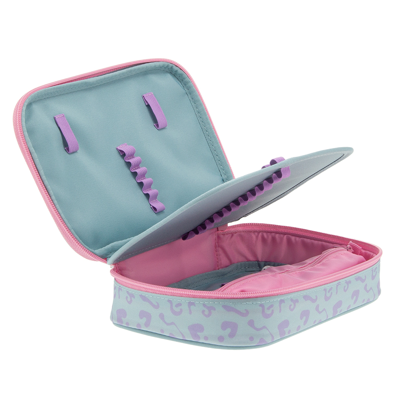 Detský školský jednoposchodový peračník s dvomi klopami, s 25 gumovými úchytmi na ceruzky a perá, gumu a prepážkou s priehľadnou fóliou a rozvrhom hodín.