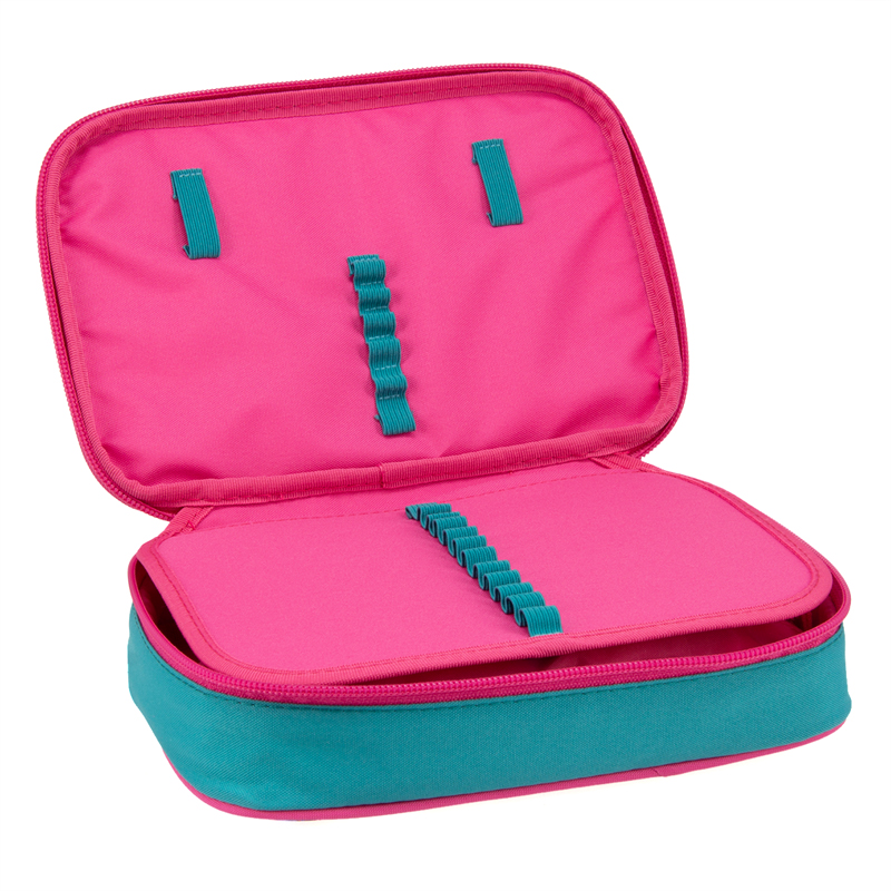 Prázdny jednoduchý peračník s jednou klopou,s gumovými úchytmi na ceruzky a perá, vreckom na suchý zips vhodným na peniaze, gumu a prepážkou s priehľadnou fóliou a rozvrhom hodín.