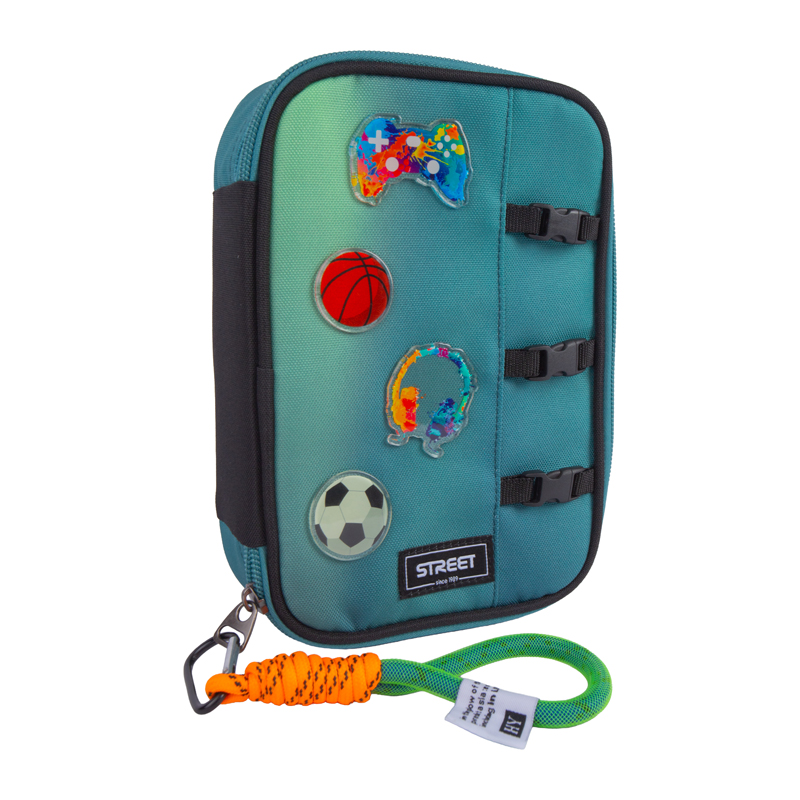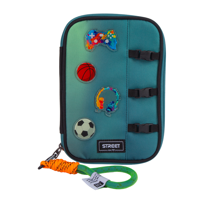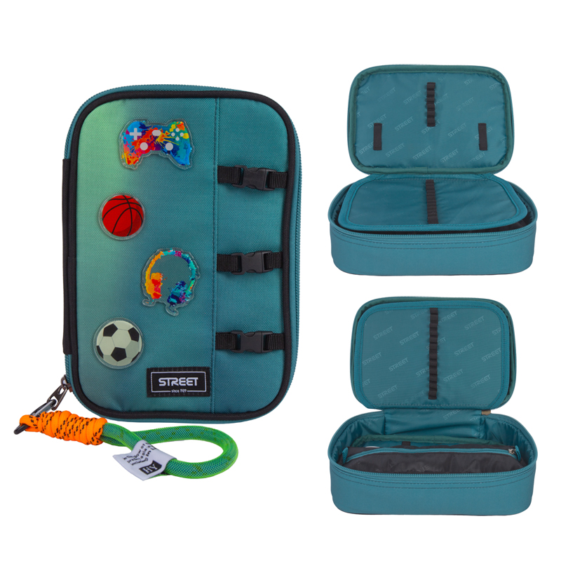 Prázdny jednoduchý peračník s jednou klopou,s gumovými úchytmi na ceruzky a perá, vreckom na suchý zips vhodným na peniaze, gumu a prepážkou s priehľadnou fóliou a rozvrhom hodín.