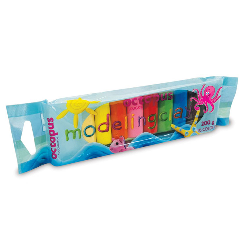 Plastelína OCTOPUS, v balení 10 farieb vo forme valčeka, hmotnosť 200 g. Hmota vo fólii s eurozávesom, určená na modelovanie jednoduchých tvarov, ktoré sa dajú pretvárať na iné. Odtiene: biela, telová, žltá, oranžová, ružová, červená, zelená, modrá, hnedá a čierna.