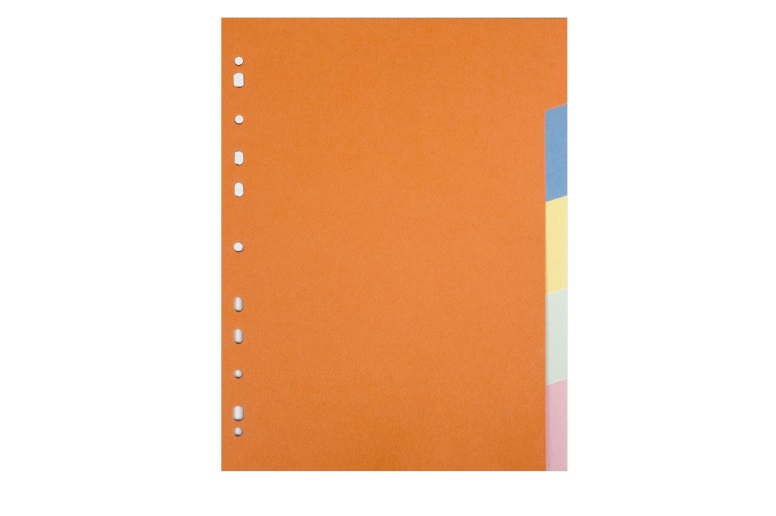 Kartónové rozraďovače farebné formátov A4 . Umožňujú 6 dielne triedenie. Univerzálne dierovanie, predtlačený popisovateľný titulný list. Formát A4 umožňuje využitie rozraďovača pri ukladaní dokumentov v prospektových obaloch.