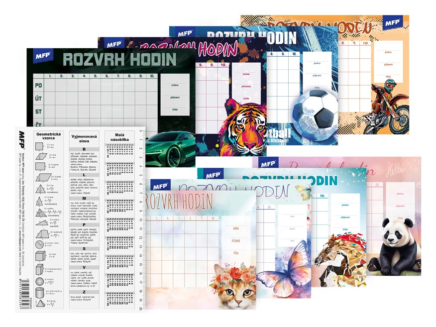 Detský rozvrh hodín, s ťahákom – vybranými slovami, matematickými vzorcami a malou násobilkou. Rozvrh hodín obsahuje: 10 vyučovacích hodín, malú násobilku, vymenované slová, geometrické vzorce, pravítko. Formát: A5. Dodávame v rôznych motívoch po 8 ks podľa skladovej zásoby.