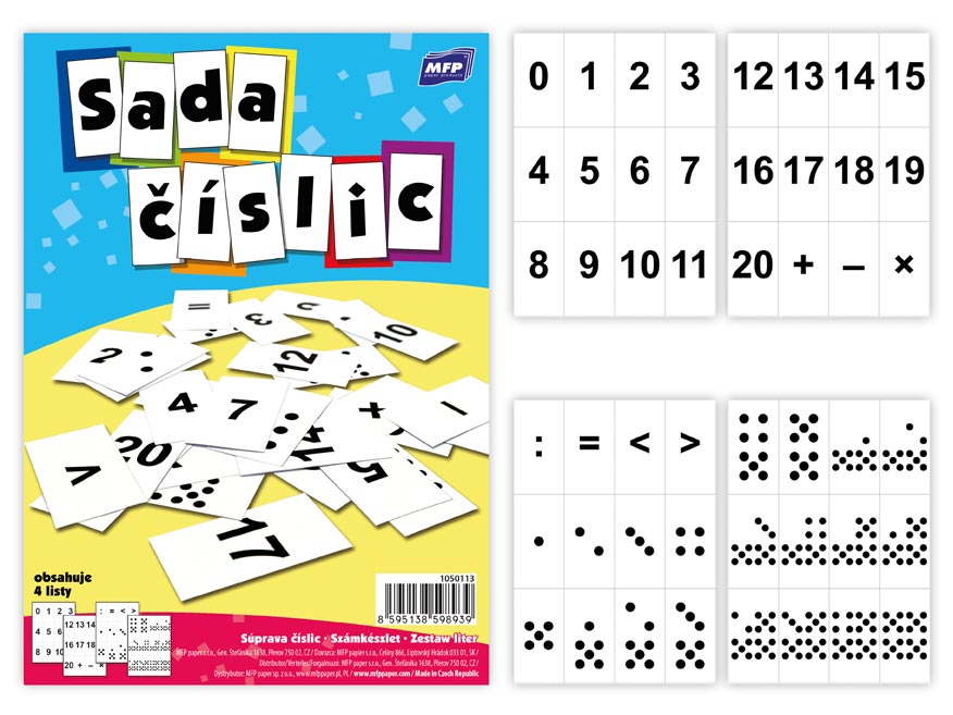 Súprava 4 ks tlače formátu 170 x 236 mm – slúži na vystrihnutie jednotlivých číslic, vhodných na vyučovanie v prvých ročníkoch základných škôl. Školáci si vďaka týmto kartičkám precvičia základné matematické počty.Súprava obsahuje 4 listy, na kto