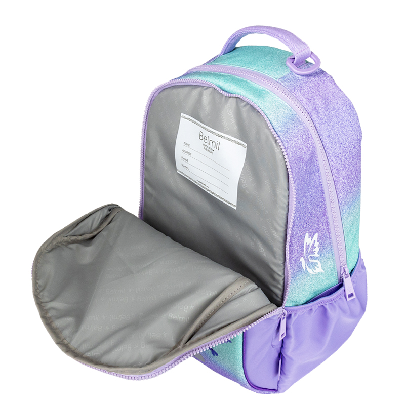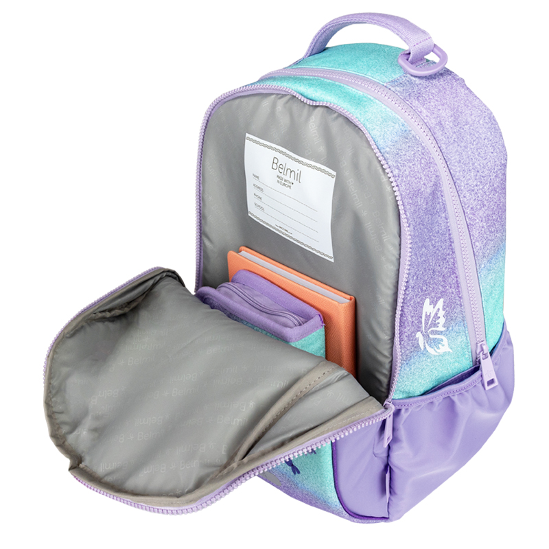 Každú tašku Belmil doplňuje pogumovaná rukoväť pre lepšie držanie a masívna reflexná pracka na zapínanie pre nikdy nevykotenú školskú náplň, pričom vo vnútri nájdu deti izolovaná časť s priestorom pre kartičku s menom a adresou alebo na rozvrh hodín. Na boku sú 2 bočné vrecká pre fľaše s nápojmi. Pre deti je pohyblivý rozdeľovač vo vnútri tašky pre lepšie rozloženie obsahu.