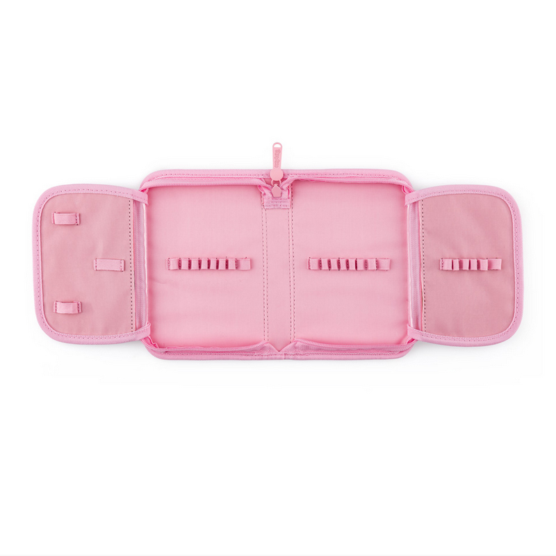 Prázdny jednoduchý peračník s jednou klopou,s gumovými úchytmi na ceruzky a perá, vreckom na suchý zips vhodným na peniaze, gumu a prepážkou s priehľadnou fóliou a rozvrhom hodín.