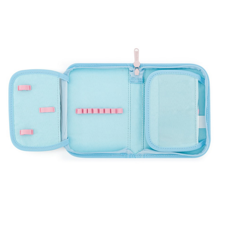 Detský školský jednoposchodový peračník s dvomi klopami, s 25 gumovými úchytmi na ceruzky a perá, gumu a prepážkou s priehľadnou fóliou a rozvrhom hodín. V peračníku je pravítko 15cm + guma + struhatko.