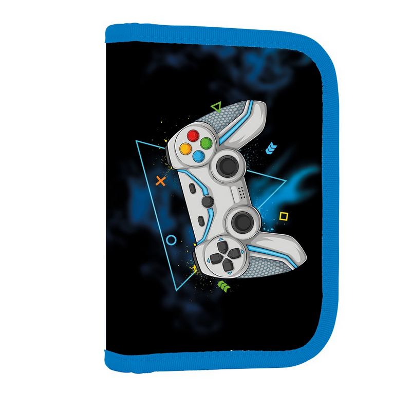 Prázdny jednoduchý peračník s jednou klopou,s gumovými úchytmi na ceruzky a perá, vreckom na suchý zips vhodným na peniaze, gumu a prepážkou s priehľadnou fóliou a rozvrhom hodín.