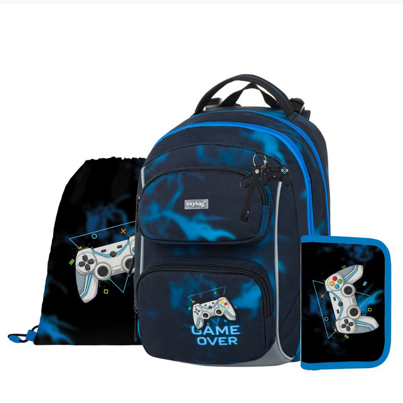 Trojdielny školský set sa skladá zo školskej tašky Oxy Jumper, jednoposchodového prázdneho peračníka, viacúčelového vrecka na prezúvky.
