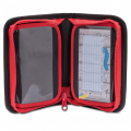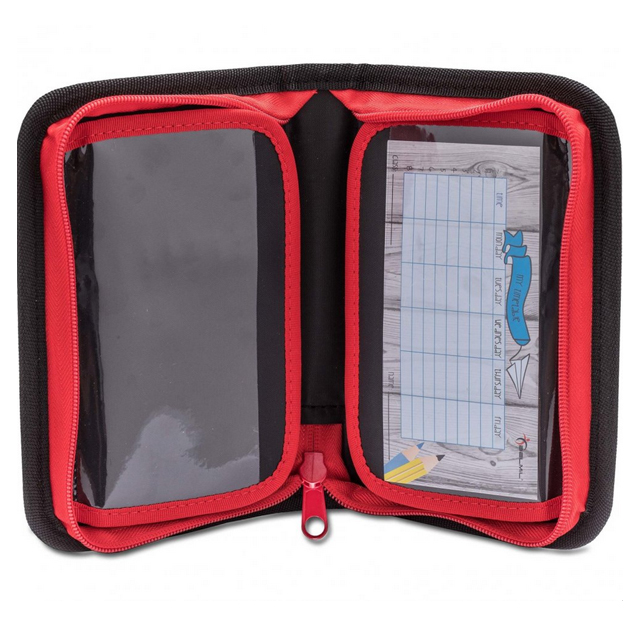 Prázdny jednoduchý peračník s jednou klopou,s gumovými úchytmi na ceruzky a perá, vreckom na suchý zips vhodným na peniaze, gumu a prepážkou s priehľadnou fóliou a rozvrhom hodín.