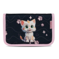 Prázdny jednoduchý peračník s jednou klopou,s gumovými úchytmi na ceruzky a perá, vreckom na suchý zips vhodným na peniaze, gumu a prepážkou s priehľadnou fóliou a rozvrhom hodín.