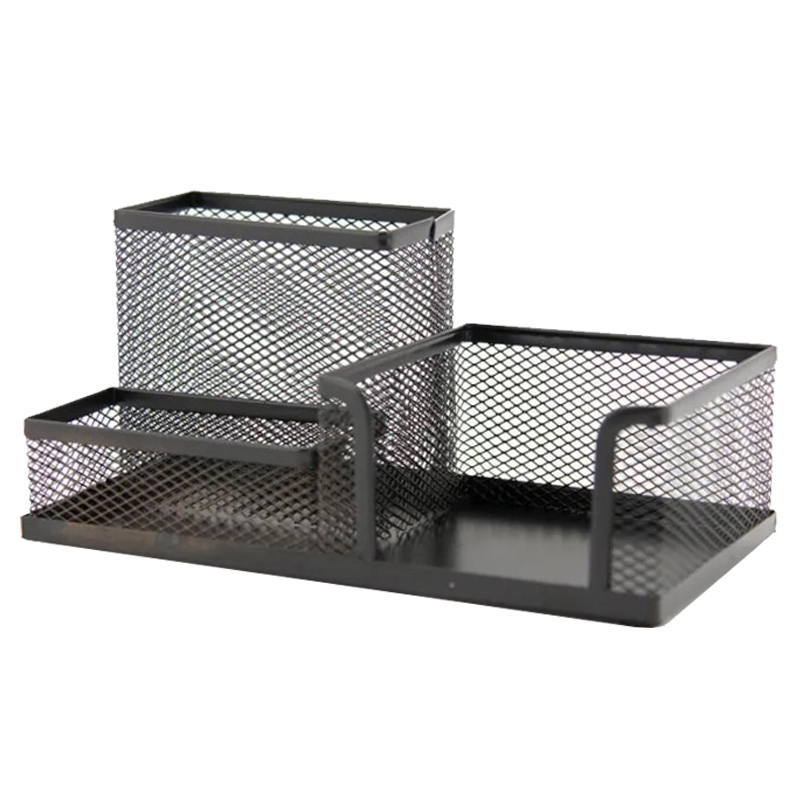 Multifunkčný stolný organizér na kancelárske potreby, prehľadne usporiadané všetky potrebné maličkosti. Čierny kovový organizér so stojanom na ceruzky, priehradkou na kancelárske doplnky a kockou na poznámkový bloček. Do stojanu je možné vložiť poznámkový blok o rozmeroch až 10 x 10 cm.
