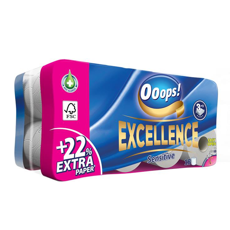 OOOPS! Excellence Sensitive prináša najvyšší štandard 3-vrstvového toaletného papiera pre každodenné použitie. Najmodernejšie technologické spracovanie prináša výnimočnú hebkosť a mäkkosť. Variant Sensitive je bez vône. Ekonomicky výhodné balenie 16 kotúčikov je vybavené odnosným pútkom a otváracou perforáciou pre jednoduchú manipuláciu. Rad Excellence je ideálnou voľbou pre náročných. Materiál:100% celulóza Veľkosť balenia:16 rol Počet vrstiev:3 Počet útržkov:150