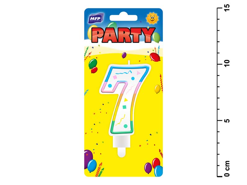 Tortová sviečka v tvare číslice 7. Duhová potlač z jednej strany. Rozmer: 43mm x 94mm x 10mm (Š x V x H)