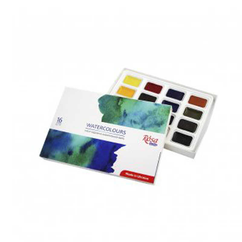 Akvarelové sady ROSA Studio 16 panvíčiek sú tvorené z tradičných farieb akvarelovej techniky. Farby v akvarelovej sade sa dajú ľahko miešať a vytvárať tak širokú paletu nových farieb a odtieňov. Väčšina farieb v sade sú vyrábané jediným pigmentom, ktorý umožňuje učiť sa a experimentovať s miešaním. Po zaschnutí tvoria farby matnú farebnú vrstvu, vďaka ktorej je práca vynikajúca a atmosférickejšia. • Základné farby po zmiešaní poskytujú širokú paletu farieb • Vysoko kvalitné pigmenty poskytujú kombináciu intenzity a priehľadnosti akvarelov • Každá farba má široký rozsah od nasýtenia v hustej vrstve po svetlo priehľadnú po zriedení • Prírodné rastlinné spojivo s arabskou gumou a elastické po vysušení • Tradičná technika prirodzeného sušenia akvarelov poskytuje ľahké riedenie vodou a nanášaním štetcom.