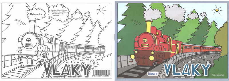 Omalovánka s motívom Vlaky. Formát: A5, 16 strán z toho 8 farebných a 8 čiernobielych strán. Kvalita papiera: 100gr biely ofsetový.