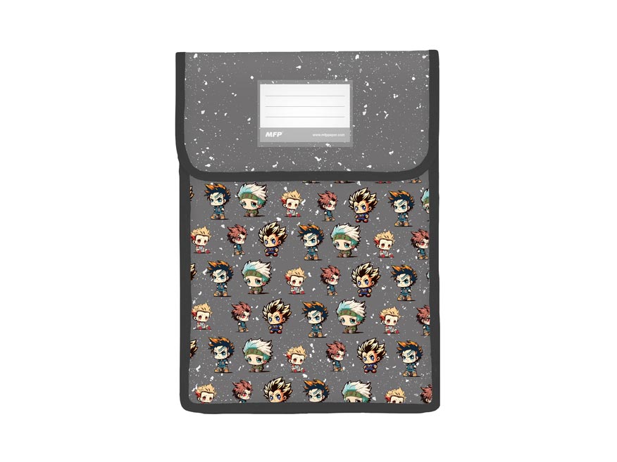 Kvalitná zložka vo formáte A4 v čiernej farbe s motívom anime maskotov. Ochráni zošity, dokumenty a iné dôležité dokumenty. Na chlopni zložky sa nachádza štítok pre popis. Uzatváranie na suchý zips zaručuje, že sa obsah nevysype ani nezničí. Okraje z