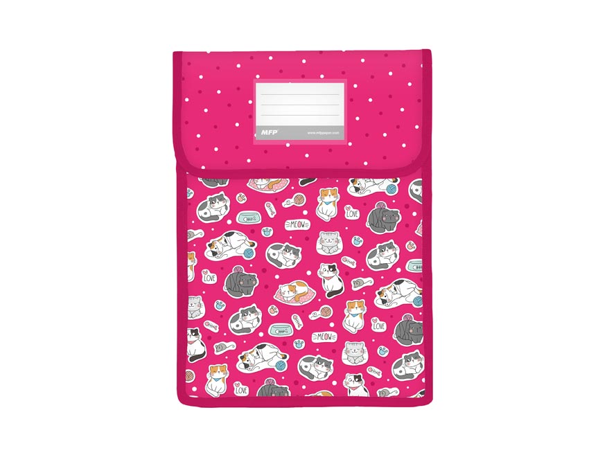 Kvalitná zložka vo formáte A4 v ružovej farbe s motívom mačky. Ochráni zošity, dokumenty a iné dôležité listiny. Na chlopni zakladača je štítok pre popis. Uzatváranie na suchý zips zaručuje, že sa obsah nevysype ani nezničí. Okraje zložky sú prešité.